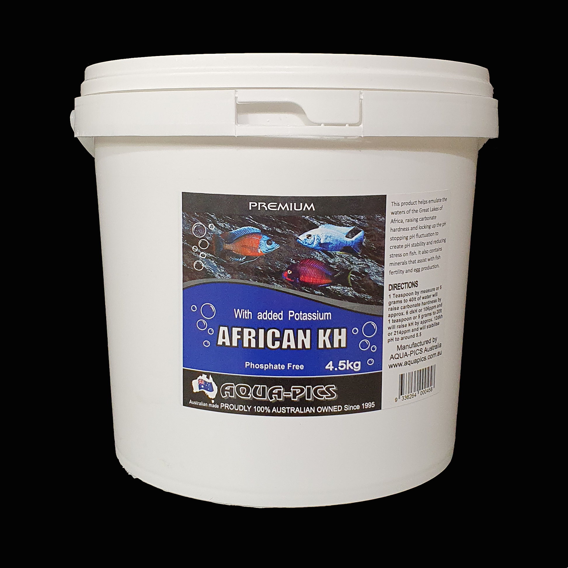 Phosphate free. African KH Buffer helps your aquarium emulate the waters of the Great Lakes of Africa. It raises KH (carbonate hardness) and stops pH fluctuation, creating pH stability and reducing stress on fish. It also contains minerals which assist with fish fertility and egg production.