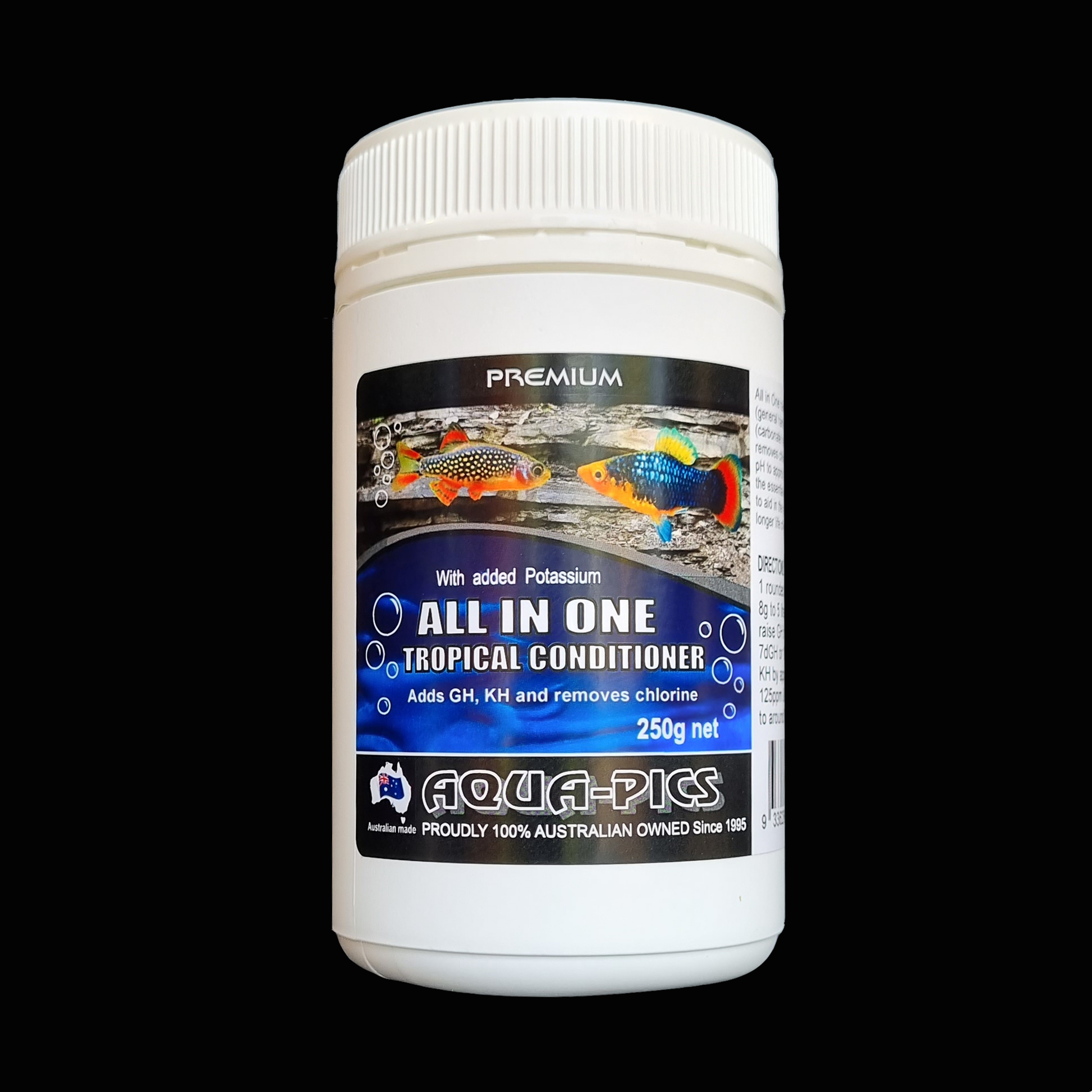 All In One Conditioner for Tropical fish is an easy-to-use, one-step mineralisation and dechlorination solution for people with small or nano freshwater aquariums who don’t want to fuss with measuring out multiple products to get their water ready for fish. With just this one product, you can raise the GH (general hardness) and the KH (carbonate hardness) at the same time, stabilising the pH of your aquarium. This product also removes chlorine, making tap water safe for fish. Aqua-Pics All In One Conditioner adds the essential minerals required to aid in the good health; longer life of your fish. Suitable for tap water and rainwater. Contains chemically clean phosphates, which should not exacerbate algae.