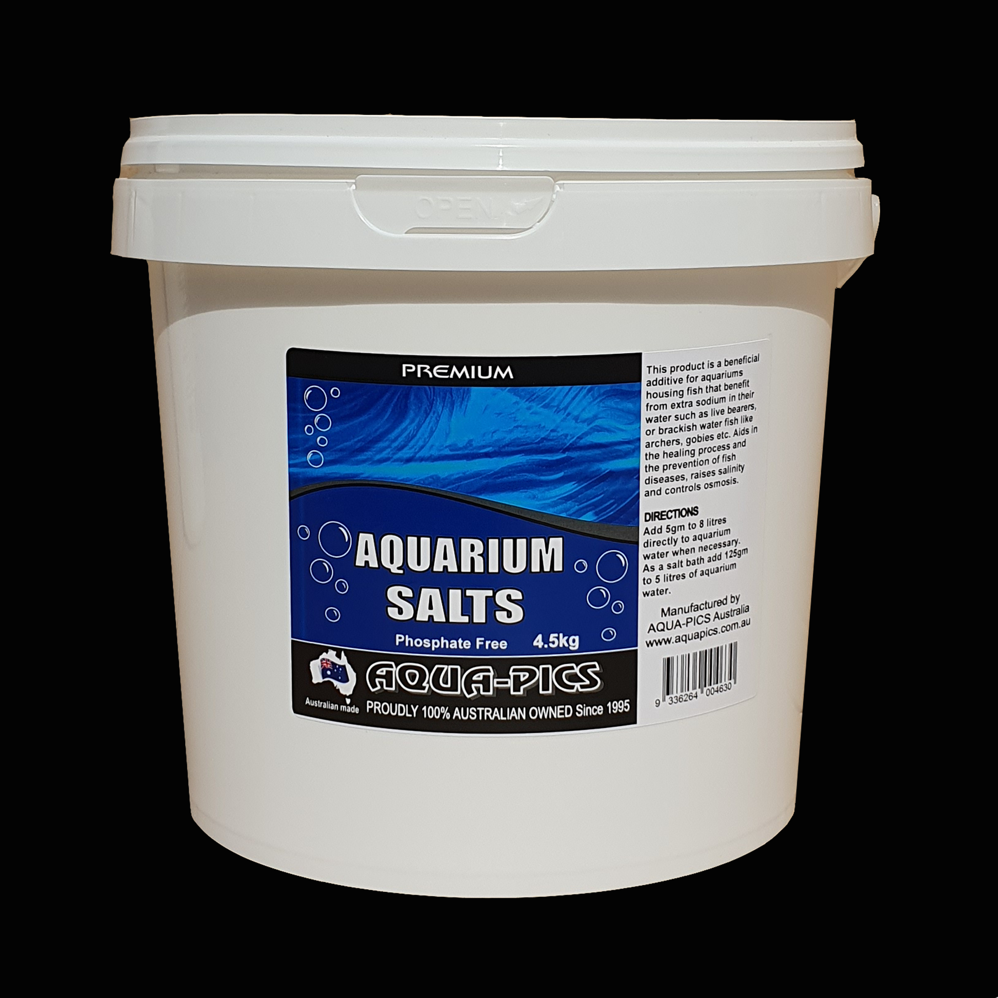 Phosphate free. Aquarium Salts raises salinity for fish that require extra sodium, such as many Australian native species, live bearers, and brackish water fish that require higher sodium levels to survive in captivity such as archers and gobies. It also helps to prevent fish diseases and infections, helps control osmosis and aids in the healing process of wounded fish.