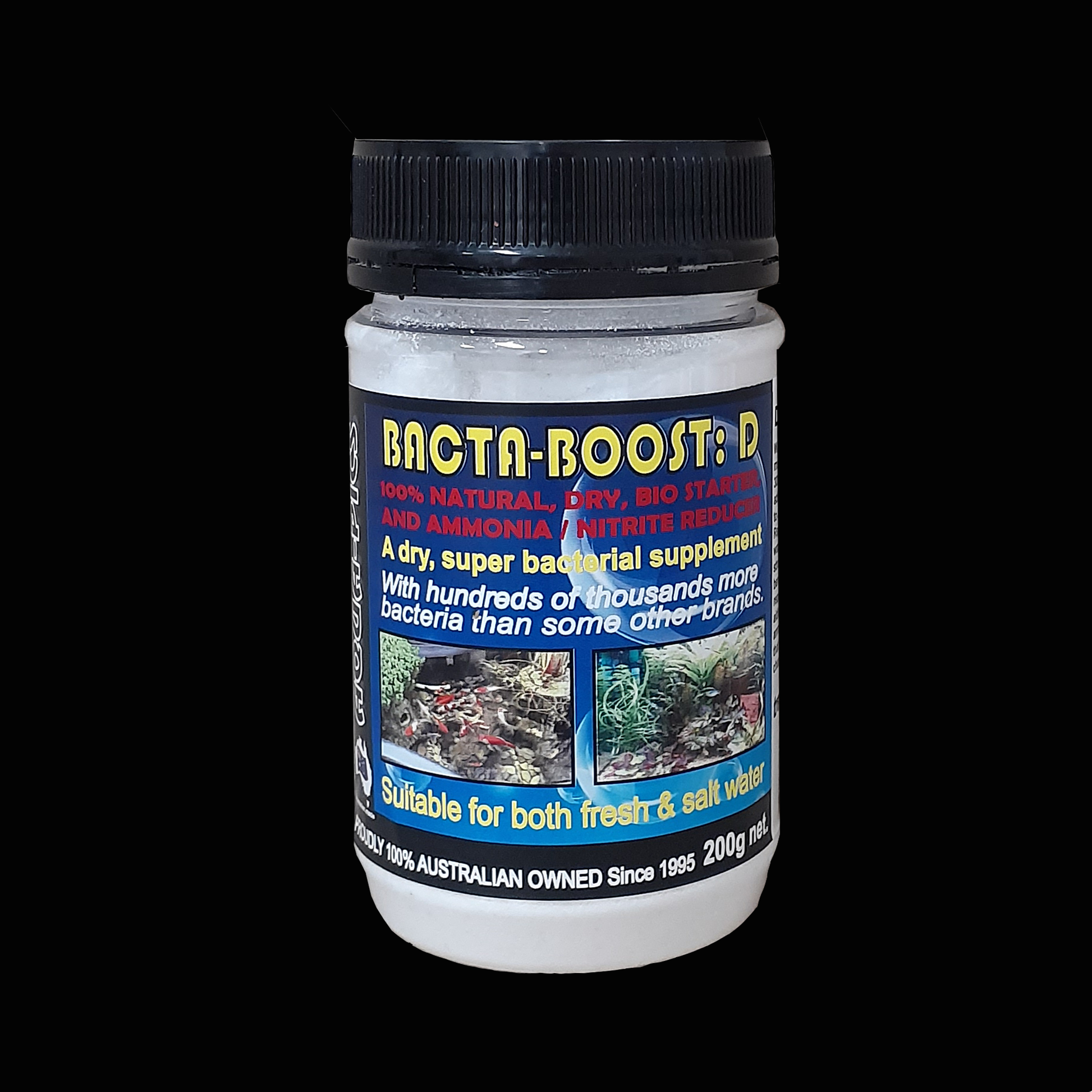 100% natural bio-starter and ammonia and nitrite reducer. Bacta-Boost D is a super concentrated dry bacteria supplement which supplies the beneficial microbes and enzymes required to break down waste and convert toxic ammonia and nitrites to nitrates. Aquarium plants and regular water changes then control the nitrates. For fresh and salt water.