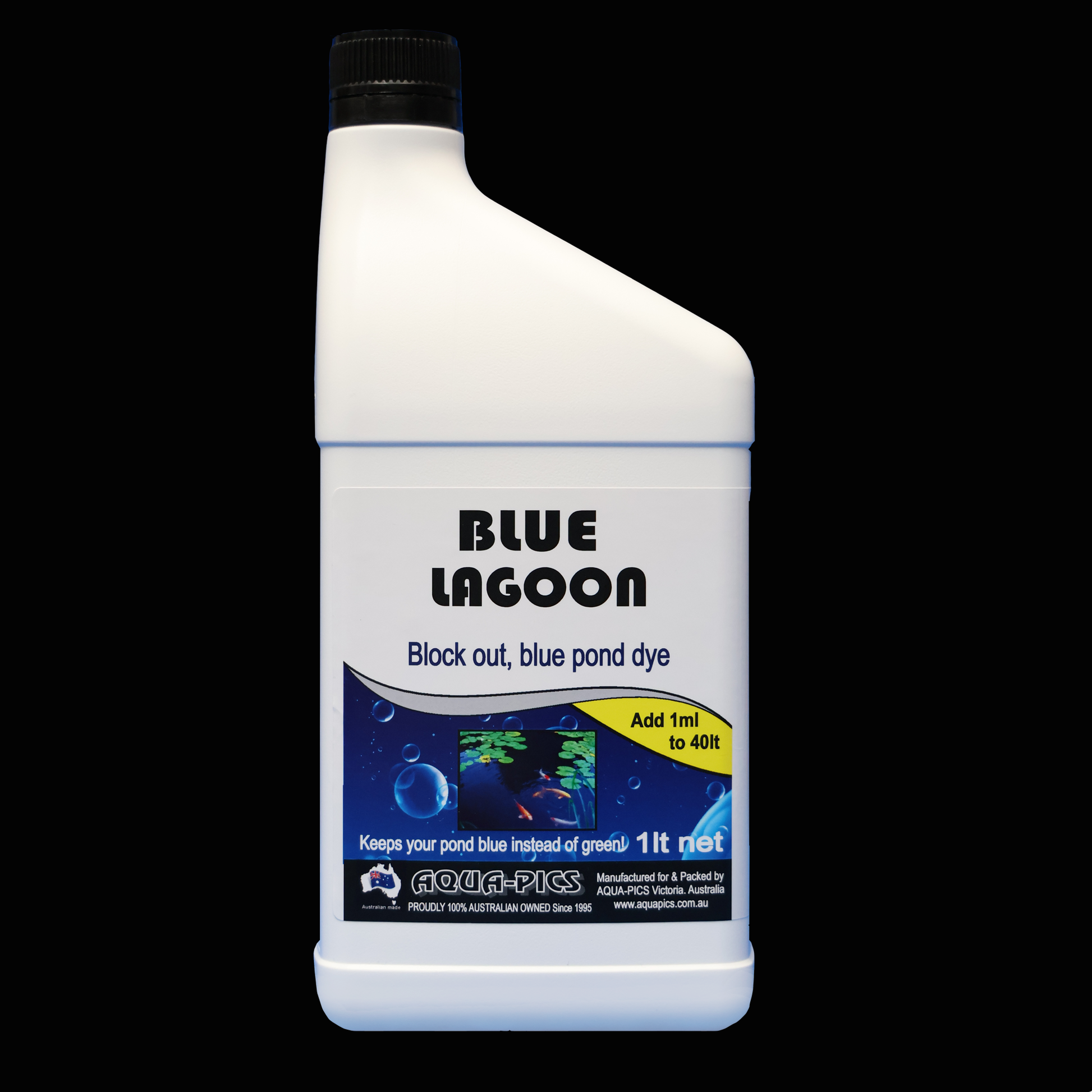 Dyes your pond or lake a beautiful blue. Reduces light penetration naturally and filters UV light from the sun. Dosage can be increased as required without harming fish but this may affect plant growth. Does not contain any methylene blue, fungicide or algaecide. Contains: Polymeric colorant developed in the USA 1 litre treats up to 40,000 litres of water.