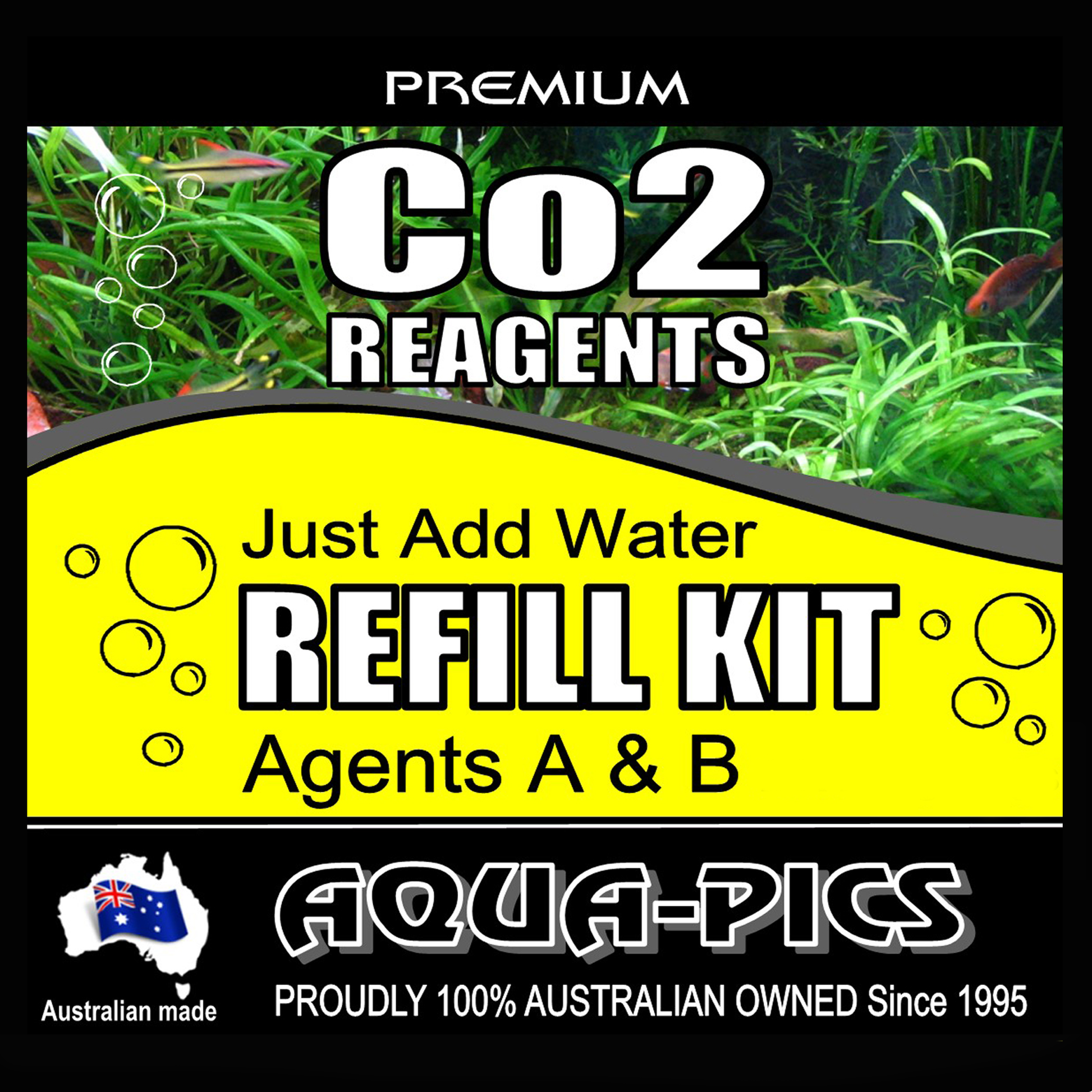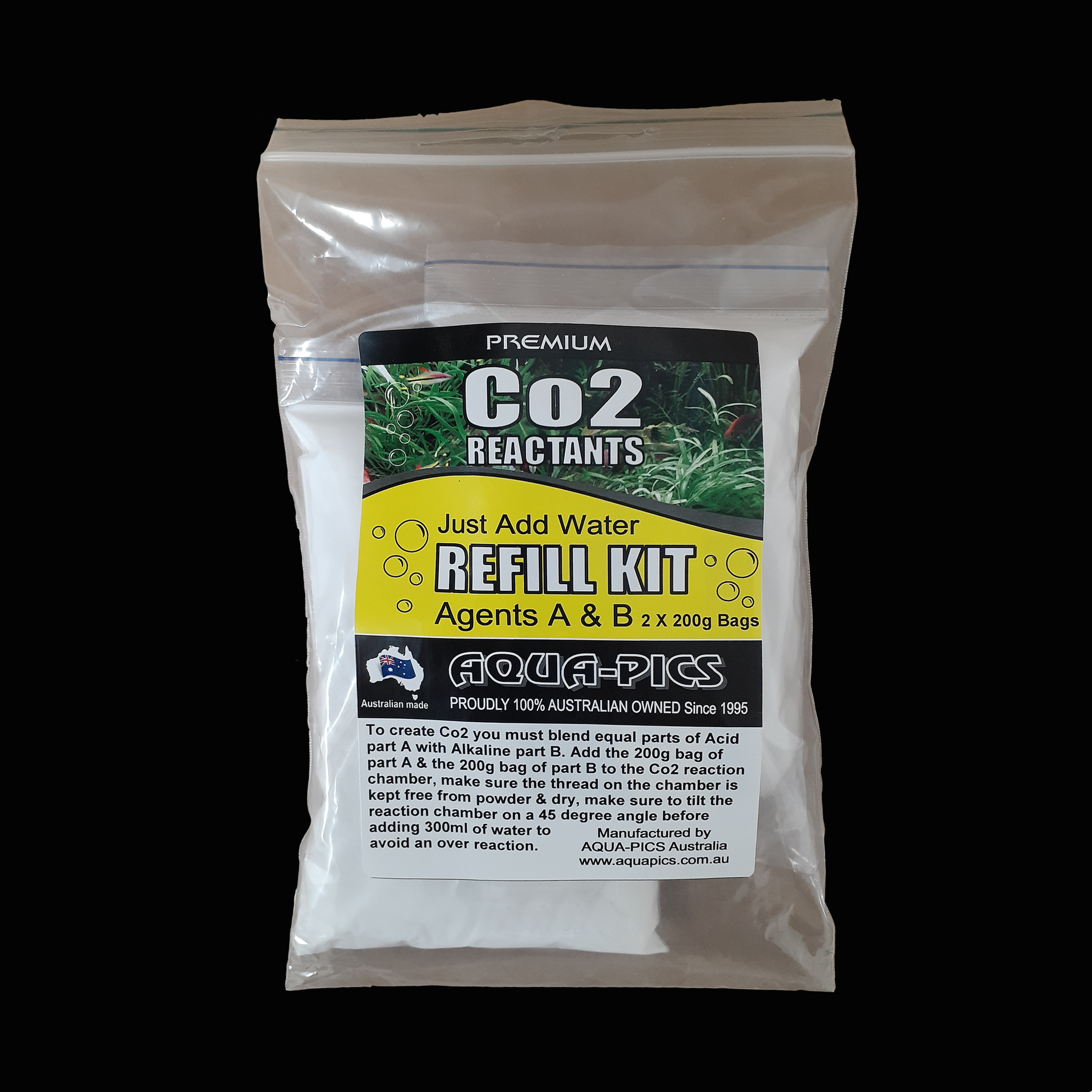 Aqua-Pics CO2 Refill Kit supplies the chemicals required for easily and conveniently making CO2 to refill aquarium CO2 systems. To create CO2, blend equal parts of Acid Part A with Alkaline Part B. Add the 200g bag of Part A and the 200g bag of Part B to the CO2 reaction chamber. Ensure the thread on the chamber is dry and kept free from powder. Be sure to tilt the reaction chamber on a 45 degree angle before adding 300ml of water. This will avoid an over reaction.