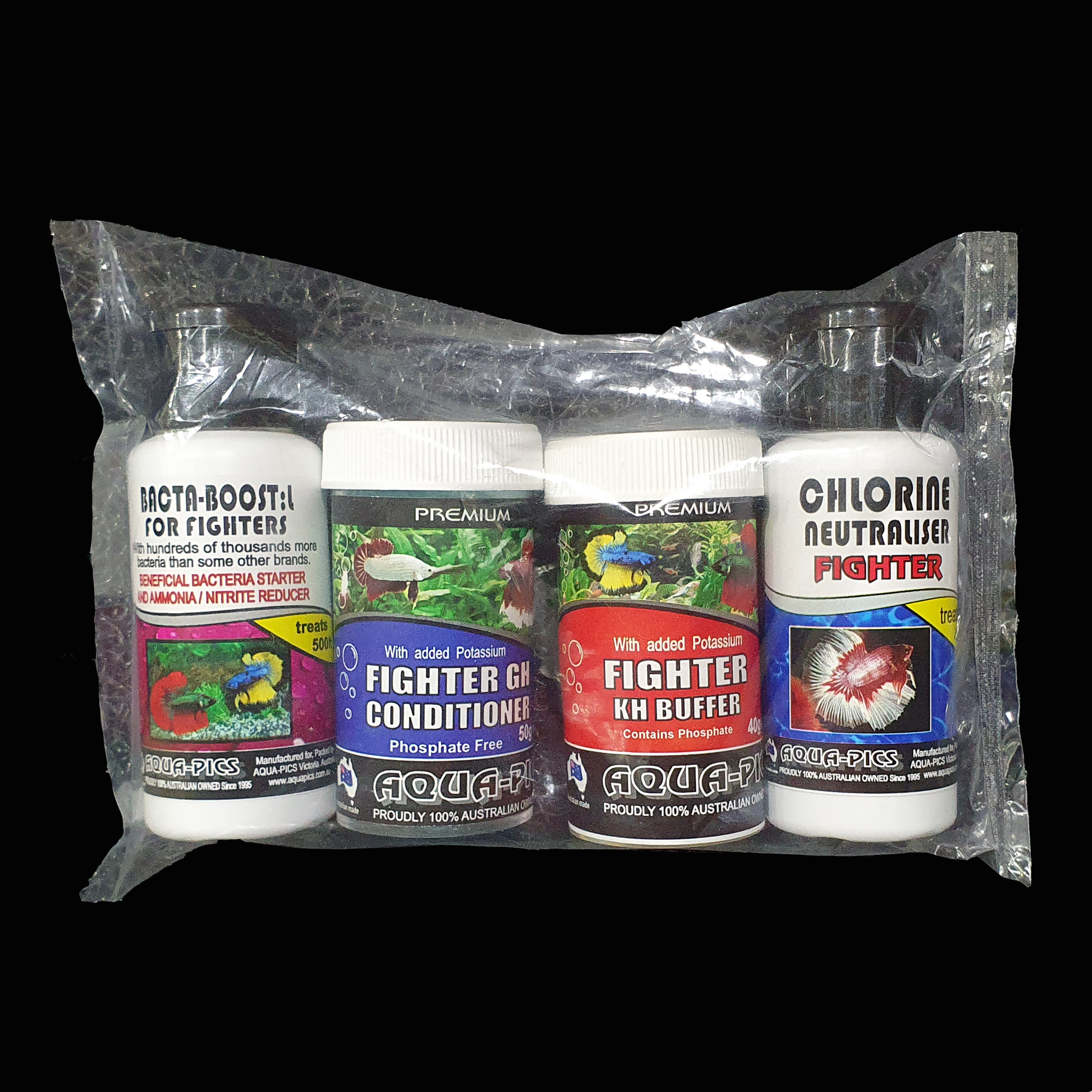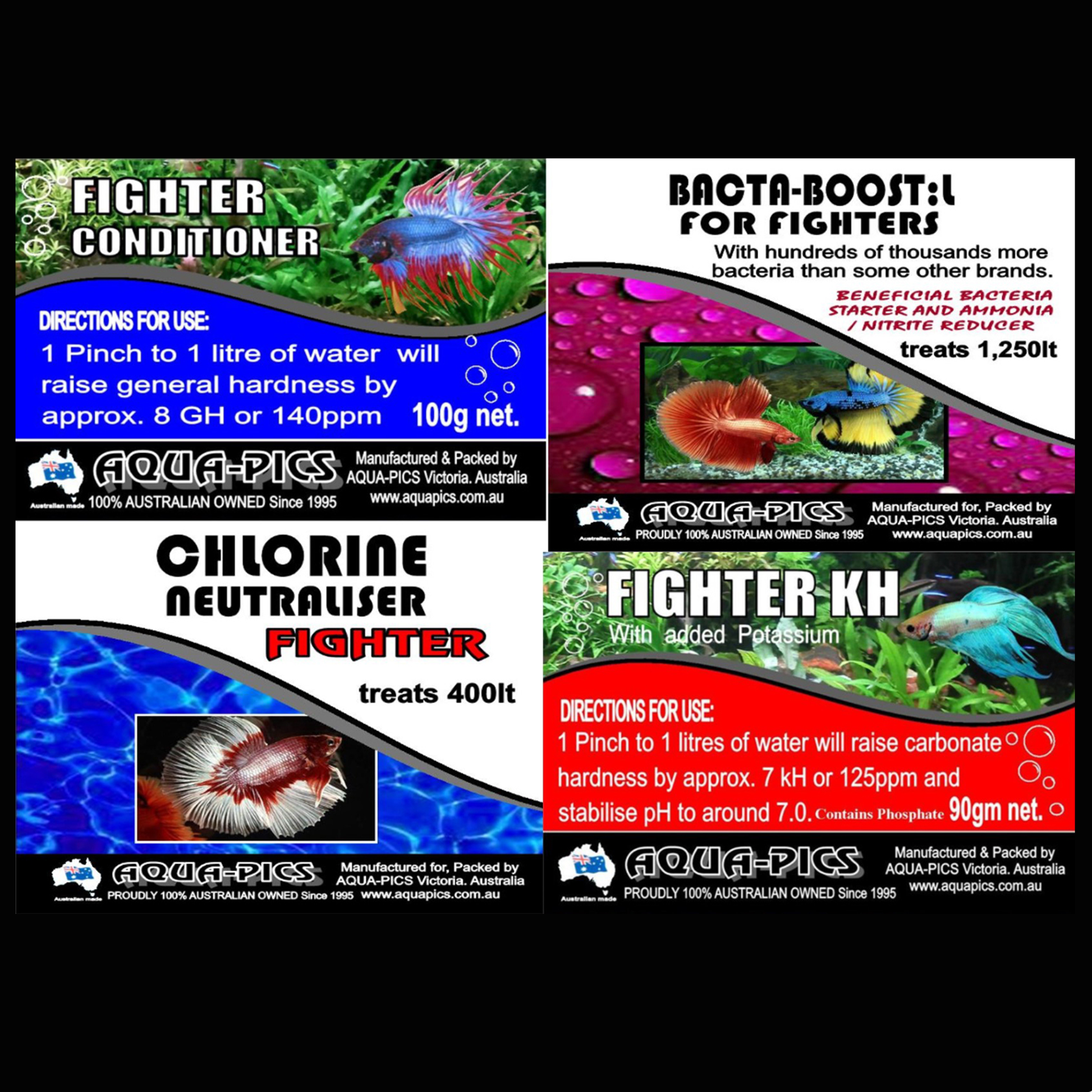 Contains: 1 x 50ml Fighter Chlorine Eliminator, 1 x 50g Fighter GH Conditioning Salts, 1 x 50ml Fighter Beneficial Bacteria Booster, 1 x 40g Fighter KH Buffer (for a stable pH of approximately 7.0).
