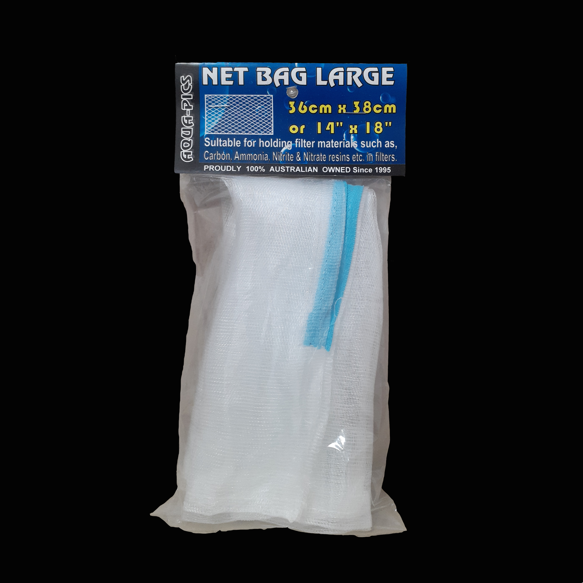 Net bags are designed to hold any type of loose media such as bio-noodles, ceramic media, zeolite or carbon. Makes removal of media for replacement or cleaning much easier. With zip closure. Large size 36cm x 38cm approx. available here.